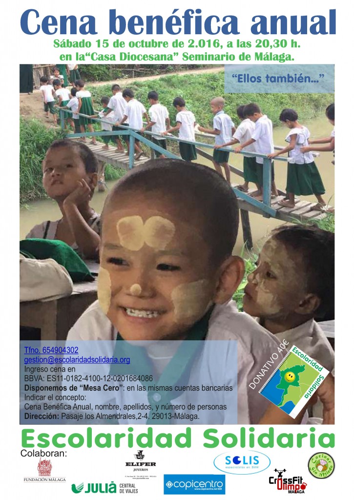 Amigos de Escolaridad Solidaria Os invitamos a la«Cena Benéfica Anual de Escolaridad Solidaria ONG.» Será el próximo día 15 de Octubre de 2016 (Sábado) a las 20.30 horas, en “La Casa Diocesana”, en el Seminario de Málaga,. Un lugar encantador y además con unas vistas a la Alcazaba y al Castillo de Gibralfaro únicas. Su dirección […]