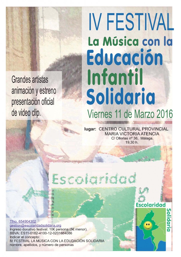 Amigos de Escolaridad Solidaria ONG, Queremos invitaros a nuestro próximo evento solidario ya en su IV edición, me refiero al Festival «La Música con la Educación Infantil Solidaria« que celebraremos el viernes 11 de marzo de 2.016 en el Centro Cultural Provincial «María Victoria Atencía» de calle Ollerías,36, Málaga (cerca de la Plaza Uncibay) a […]